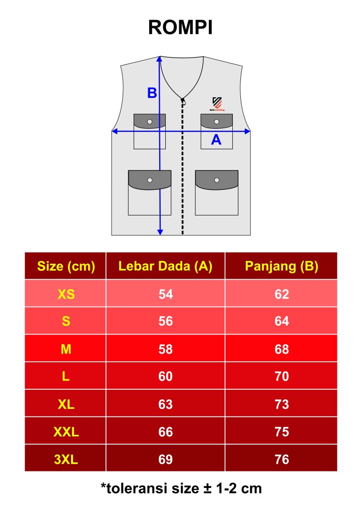 Rompi memiliki beragam ukuran mulai dai XS hingga 3XL. Berikut ini adalah ukuran standar Rompi yang kami gunakan: