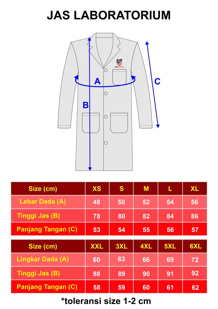 Jas Laboratorium memiliki beragam ukuran mulai dai XS hingga 5XL. Berikut ini adalah ukuran standar Jas Laboratorium yang kami gunakan: