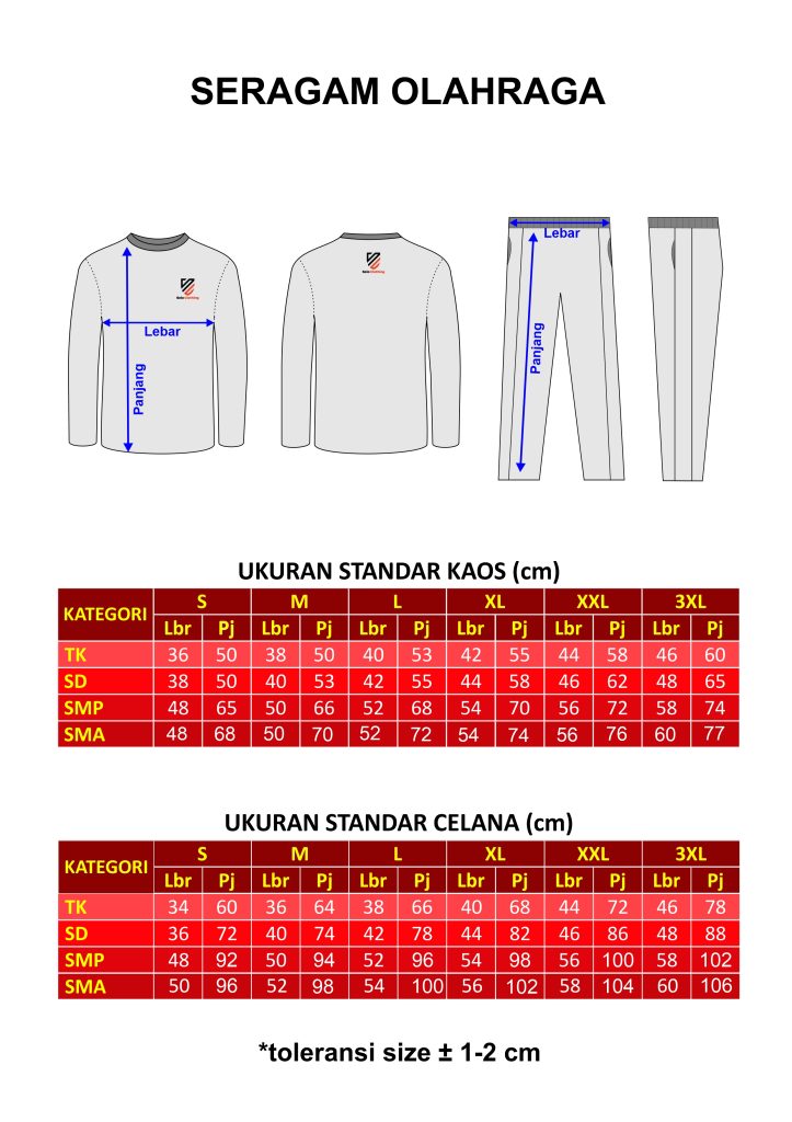 Seragam Olahraga memiliki beragam ukuran mulai dai XS hingga 5XL. Berikut ini adalah ukuran standar Seragam Olahraga yang kami gunakan: