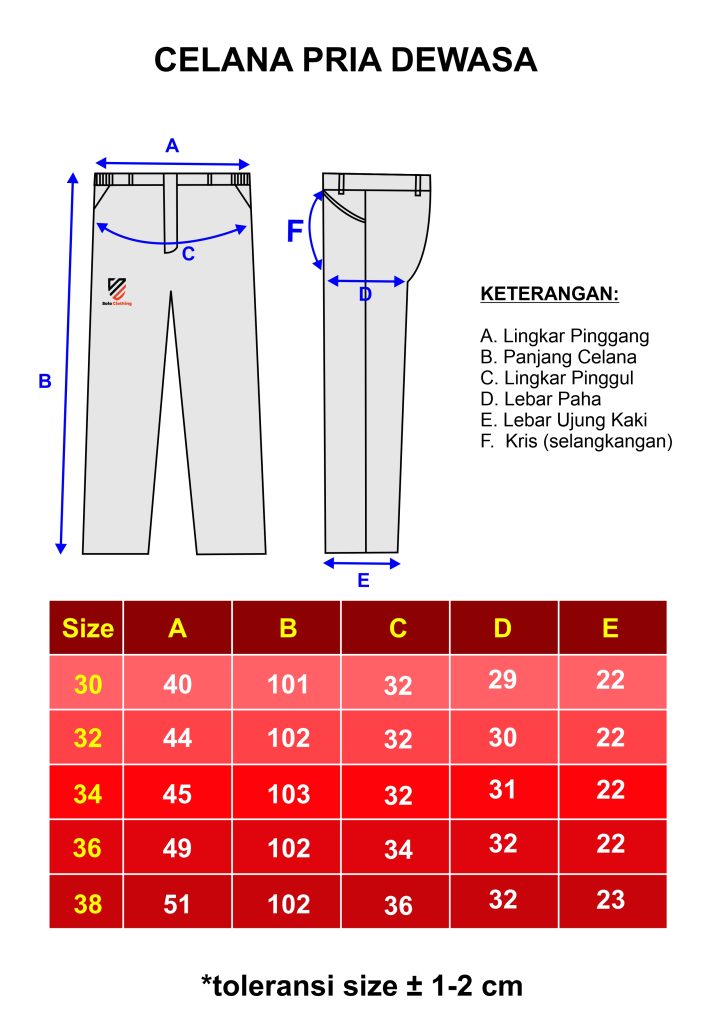 Celana Pria Dewasa memiliki beragam ukuran mulai dai 30 hingga 38. Berikut ini adalah ukuran standar Celana Pria Dewasa yang kami gunakan: