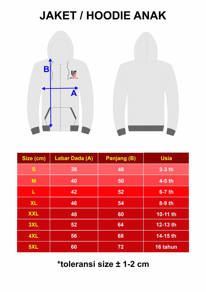 Jaket Hoodie Anak memiliki beragam ukuran mulai dai XS hingga 5XL. Berikut ini adalah ukuran standar Jaket Hoodie Anak yang kami gunakan: