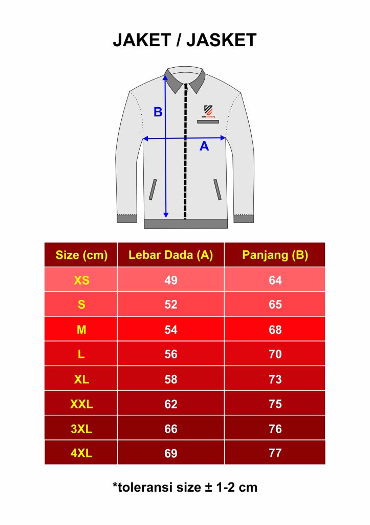 Jasket atau Jaket memiliki beragam ukuran mulai dai XS hingga 5XL. Berikut ini adalah ukuran standar jaket atau jasket yang kami gunakan: