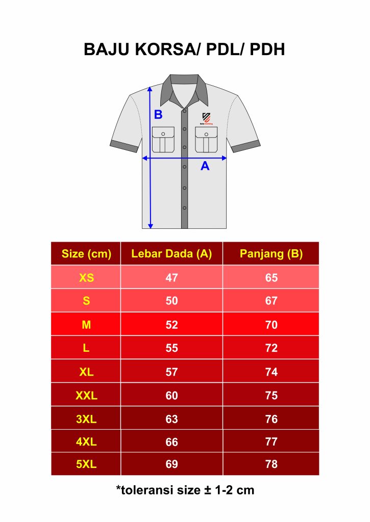 Baju Korsa PDL PDH memiliki beragam ukuran mulai dai XS hingga 5XL. Berikut ini adalah ukuran standar Baju Korsa PDL PDH yang kami gunakan: