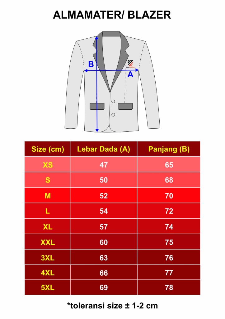 Alamater atau Blazer memiliki beragam ukuran mulai dai XS hingga 5XL. Berikut ini adalah ukuran standar Alamater atau Blazer yang kami gunakan: