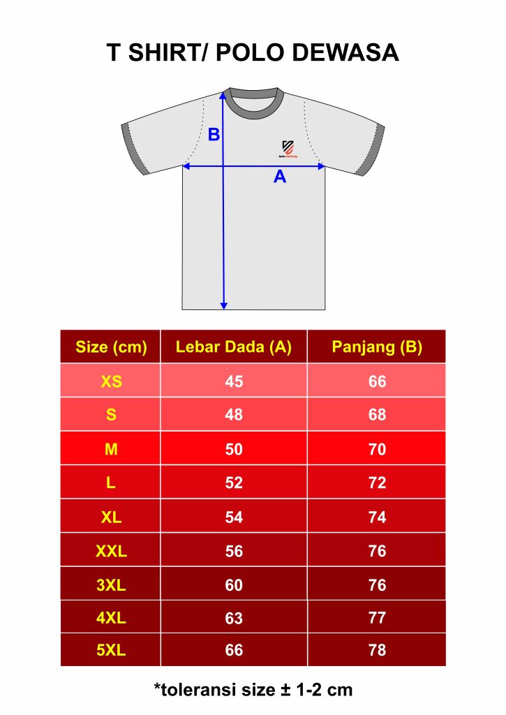 T Shirt Polo Dewasa memiliki beragam ukuran mulai dai XS hingga 5XL. Berikut ini adalah ukuran standar T Shirt Polo Dewasa yang kami gunakan: