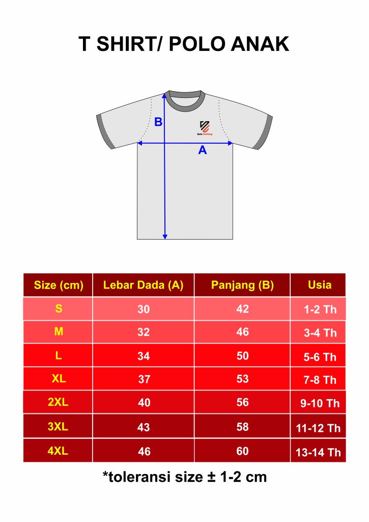 T Shirt Polo Anak memiliki beragam ukuran mulai dai XS hingga 5XL. Berikut ini adalah ukuran standar T Shirt Polo Anak yang kami gunakan: